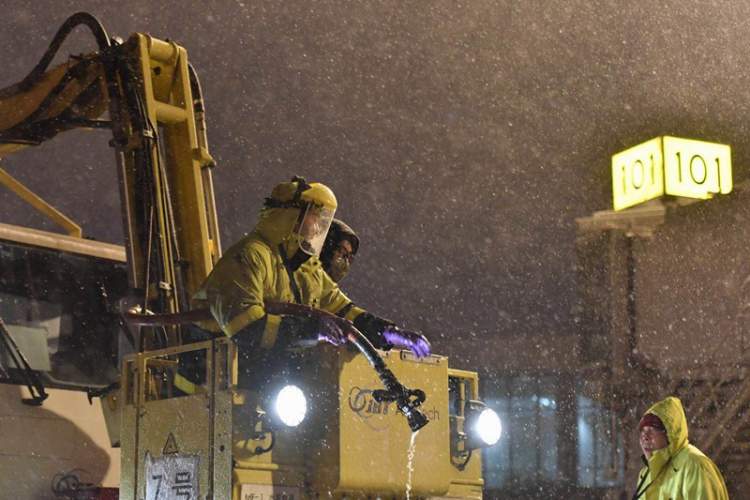 图说:东航针对26日早出港的航班,专门安排了飞机的预除冰工作。