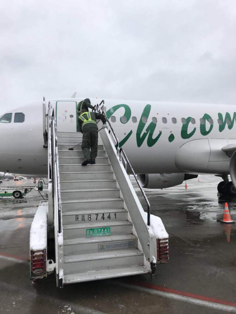 图说:春秋航空正在对客梯车仔细地进行人工除冰。旅客上下客梯车注意放慢脚步,小心湿滑。