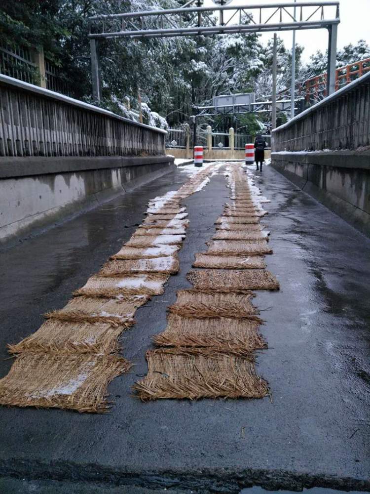 早上7点40分左右,周到君在莘庄地铁站南广场看到,积雪都已经被堆到了路边,人流较大的路段也都铺上了草垫。市民的出行基本没有受到影响。
