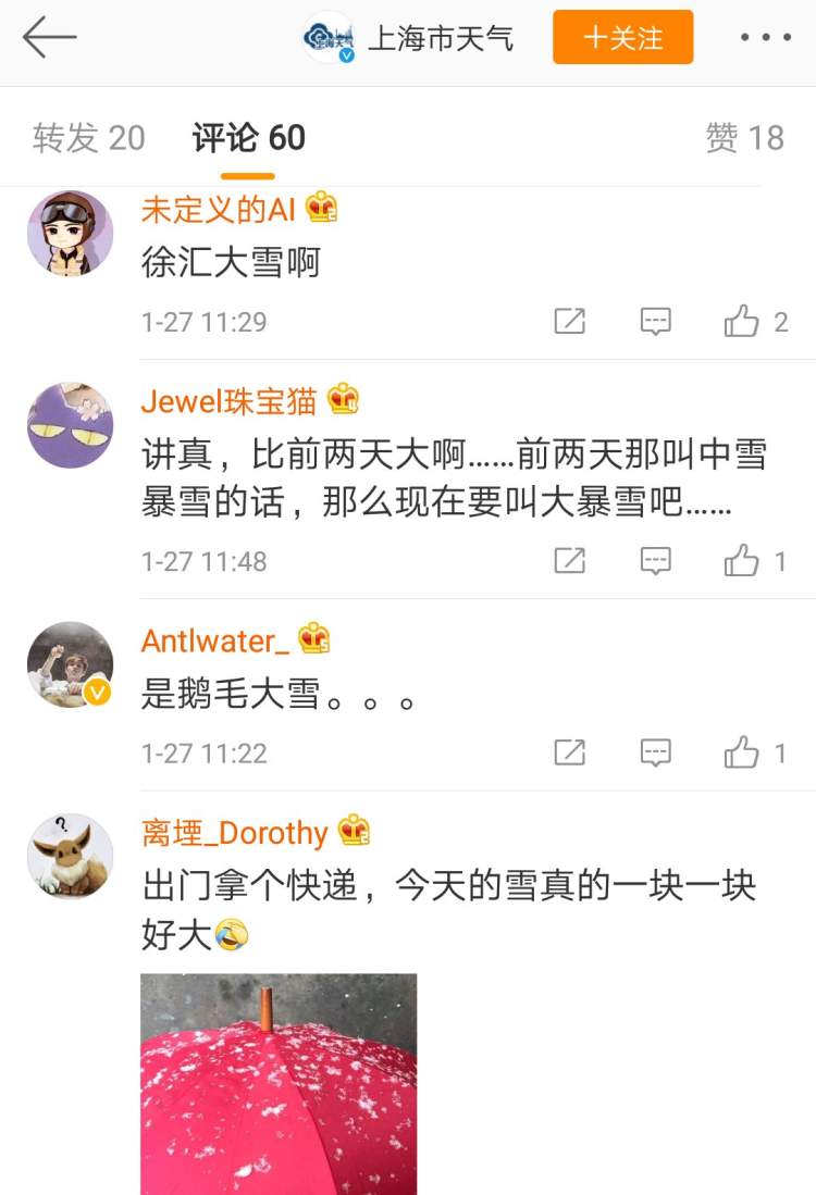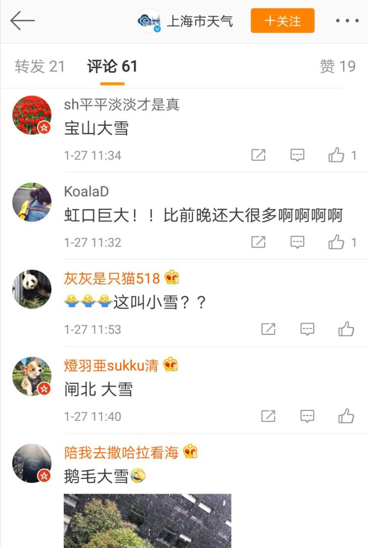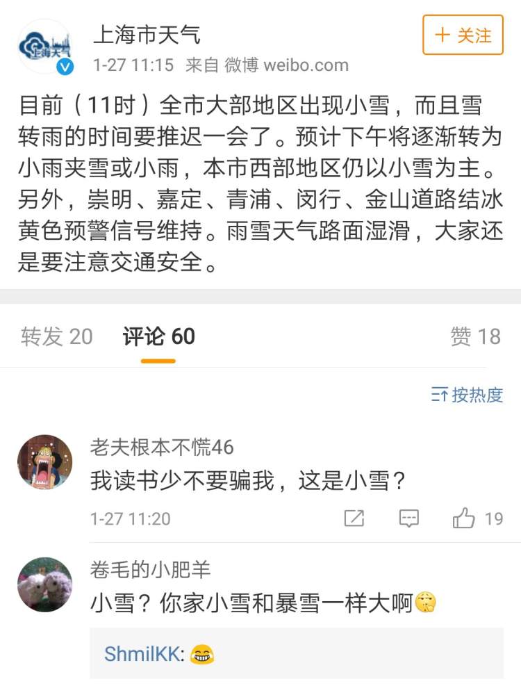 27日上午,魔都又雪花纷飞了,全市各区都飘着鹅毛大雪,然而市气象局11时许宣布:是小雪。