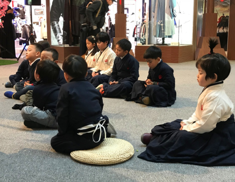 此次开笔礼以弟子礼仪、典故互动、四书诗词、朱砂点智、静坐冥想五个环节,从不同维度展现了古人的破蒙仪式。