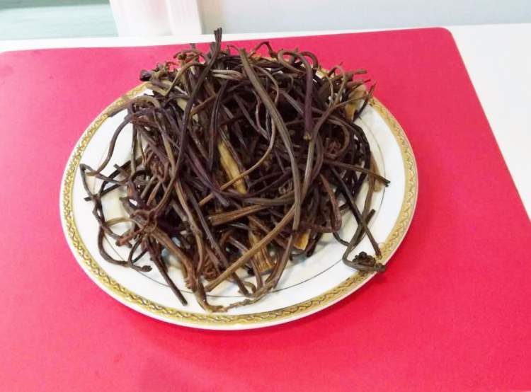 2.野山菜洗净后浸泡15分钟,然后放入肉油的锅中煮30分钟。