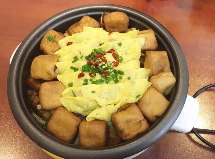 6.最后把野山菜垫底铺上豆腐,放上红烧肉,蛋饺和豆腐包,放上点绿葱和干辣椒点缀下,就可以开动咯!(建议放在电热锅中炖着吃)