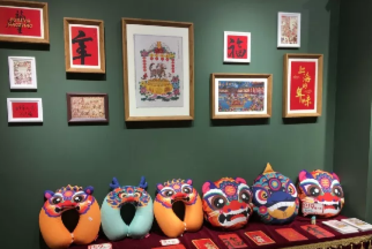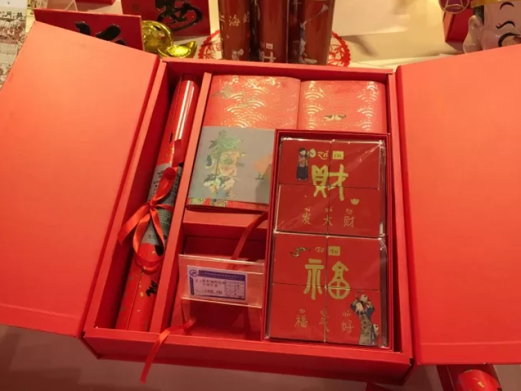 豫园文创的首款年礼——新春城隍祈福年画礼盒,也在文创市集中首度亮相。礼盒中的迎新对联和福字吉祥喜气。
