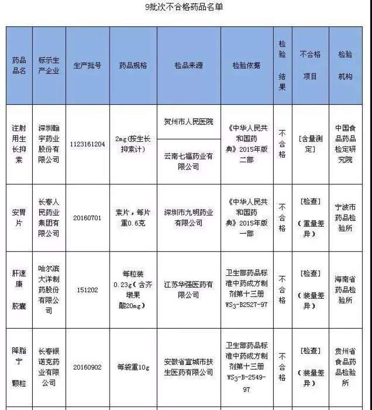 国家食药监总局2月1日通报,经中国食品药品检定研究院等9家药品检验机构检验,9批次药品检验不合格,多家上市公司产品赫然在列。