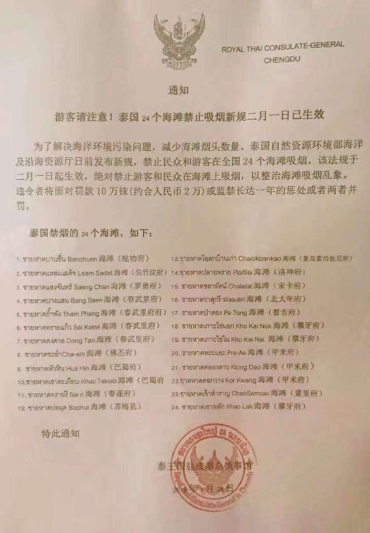 周到君从沪上各大旅行社获悉,旅行社已收到泰国政府发布的有关禁烟令的通知,并将其禁烟令发送给各个领队,并提醒近期将要出行的游客在泰国一定要注意当地的吸烟法规。