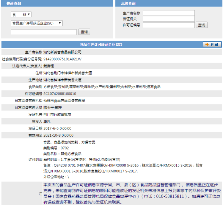 ■按照包装袋上的信息查找,食药监官网显示,该企业是拥有食品生产许可证的