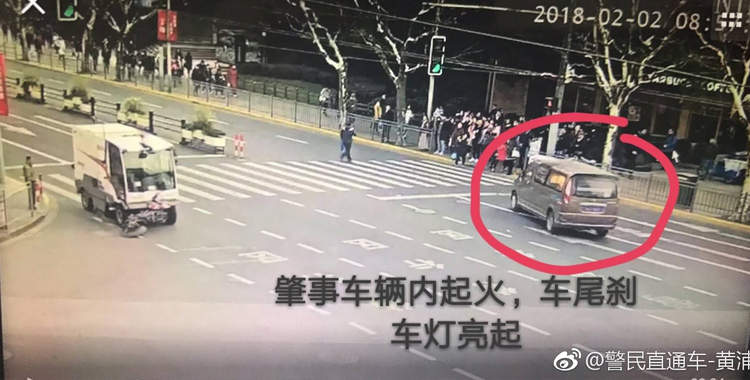 经调阅路面监控及走访现场目击者,肇事车内只有陈某一人,在8时42分时他边打电话边驾驶车辆,通话时间长达10余分钟,期间还伴有吸烟动作,未见其下车。监控显示,肇事车辆在行进过程中,从新昌路左转驶上南京西路时后排起火,有浓烟从车内外溢。在即将冲进人行道时,刹车尾灯呈亮起状态。