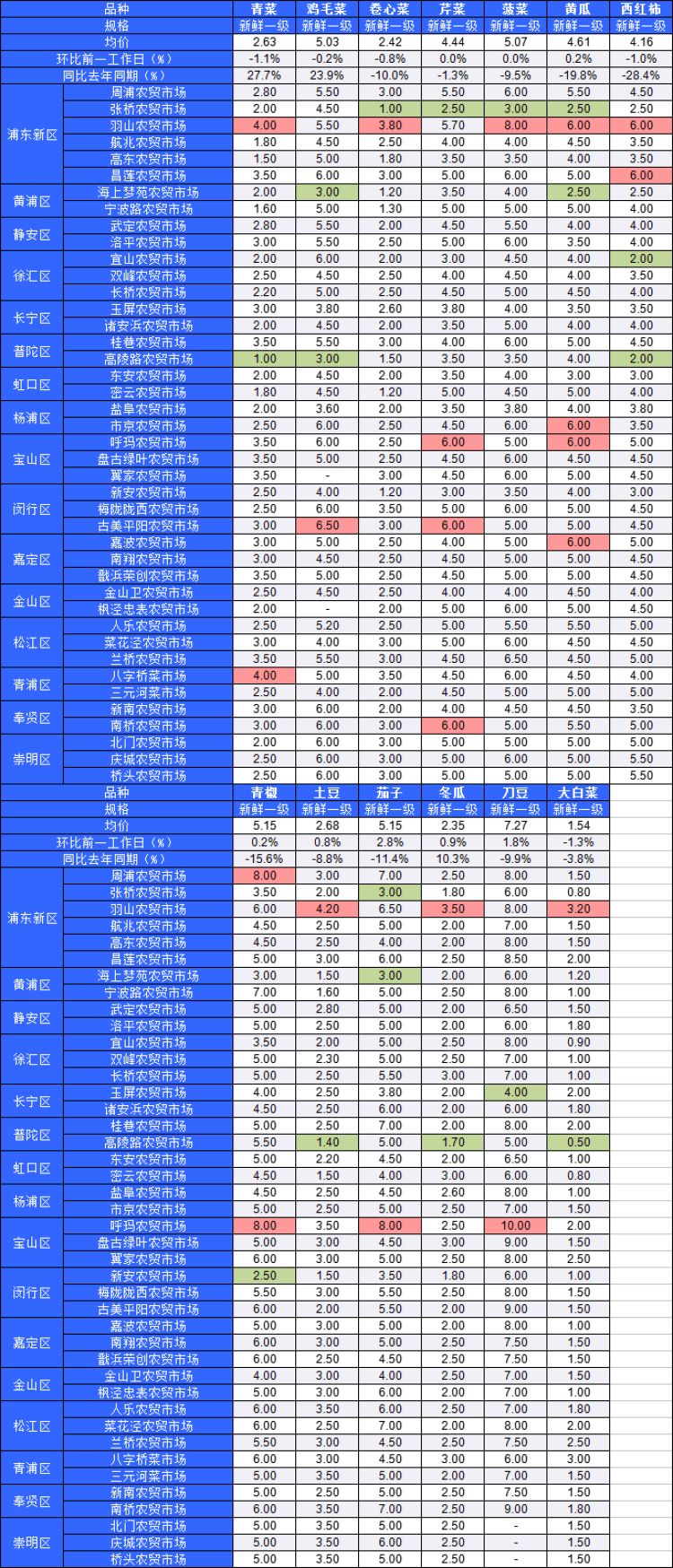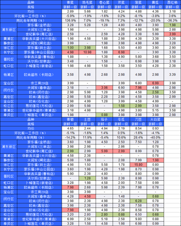■粉底标注代表该蔬菜品种在上述农贸市场或超市的最高价;绿底标注代表该蔬菜品种在上述农贸市场或超市的最低价