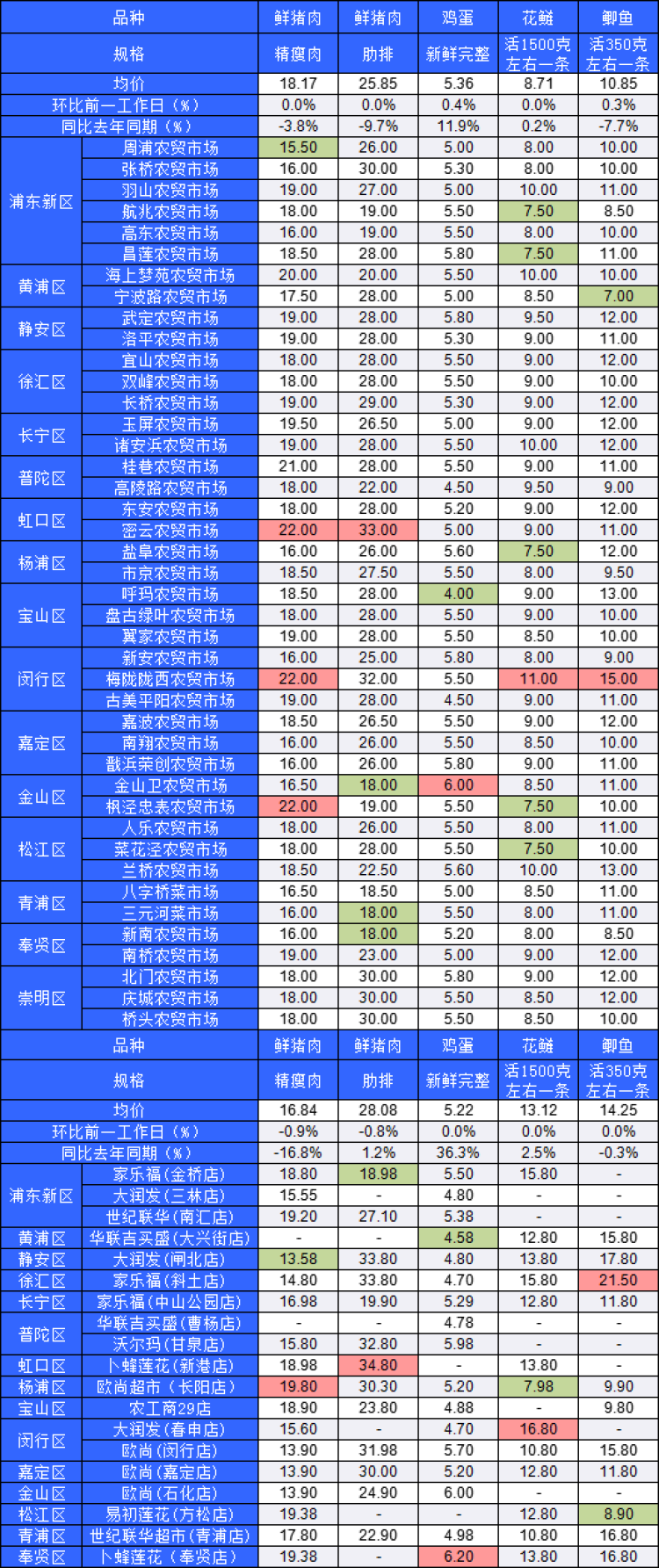 ■粉底标注代表该肉蛋鱼品种在上述农贸市场或超市的最高价;绿底标注代表该肉蛋鱼品种在上述农贸市场或超市的最低价