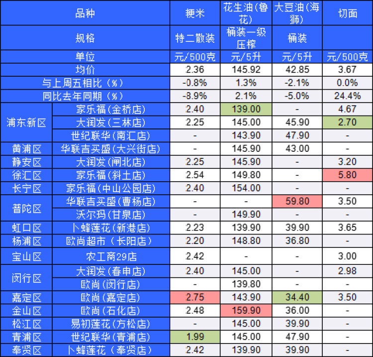 ■粉底标注代表该粮油品种在上述农贸市场或超市的最高价;绿底标注代表该粮油品种在上述农贸市场或超市的最低价