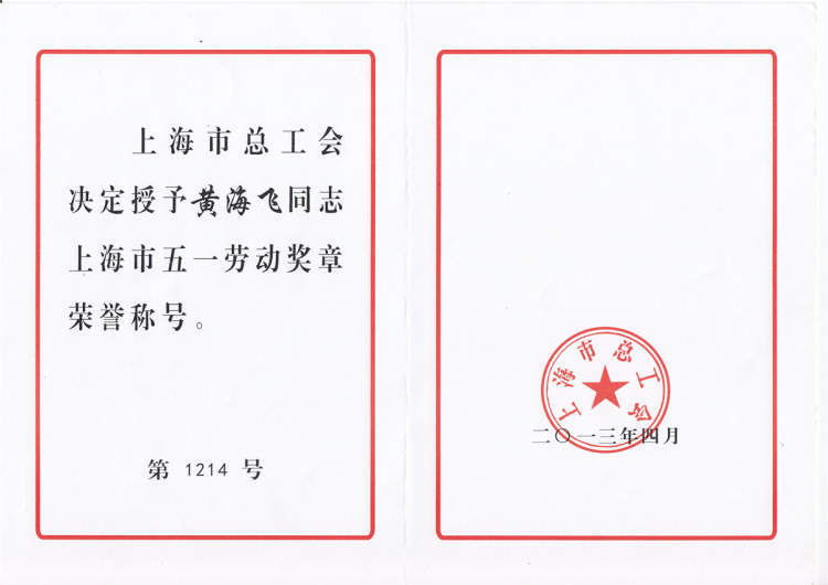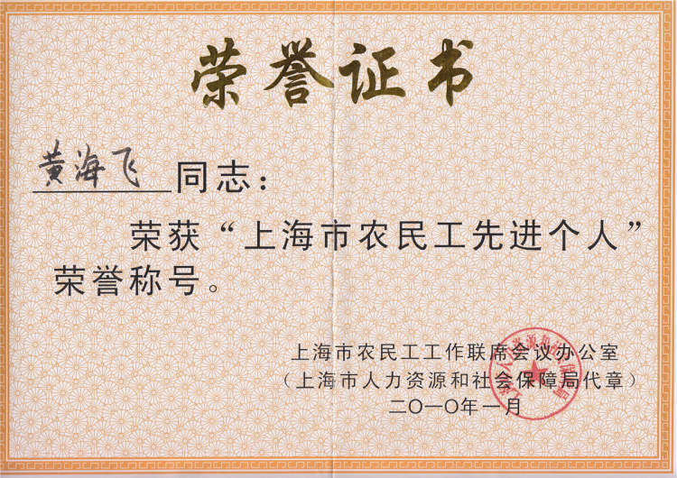 尤其是2009年黄海飞获得上海市“农民工先进个人”后享受到了上海市人才引进待遇,2013年获得上海市农民工优秀个人、上海市五一劳动奖章后,黄海飞的户口直接落到了上海。对于一个外来务工人员,能够落户上海,黄海飞感到无比激动,同时也暗暗发誓,一定要加倍地努力工作,回报企业奉献社会。