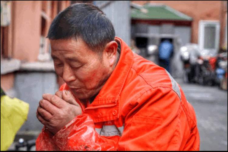 “冻手哥”此时脱去穿在外面的棉袄,手心手背连续搓了好几下,开始了他的工作。