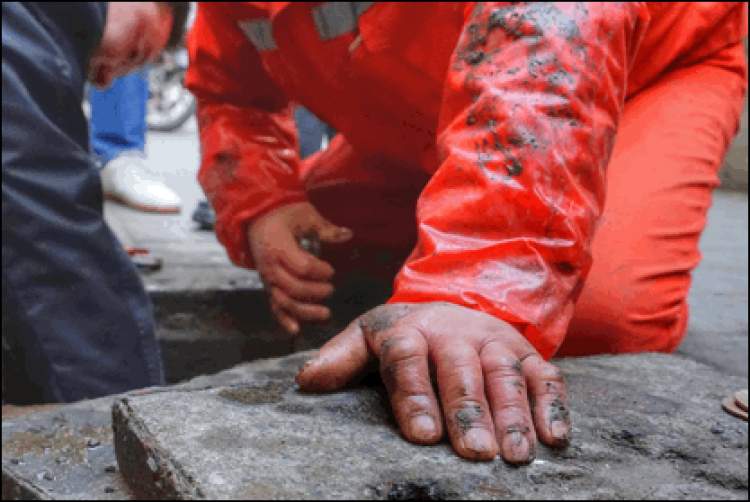 ■室外气温接近零摄氏度,“冻手哥”卞师傅徒手伸进冰冷的水中修理管道