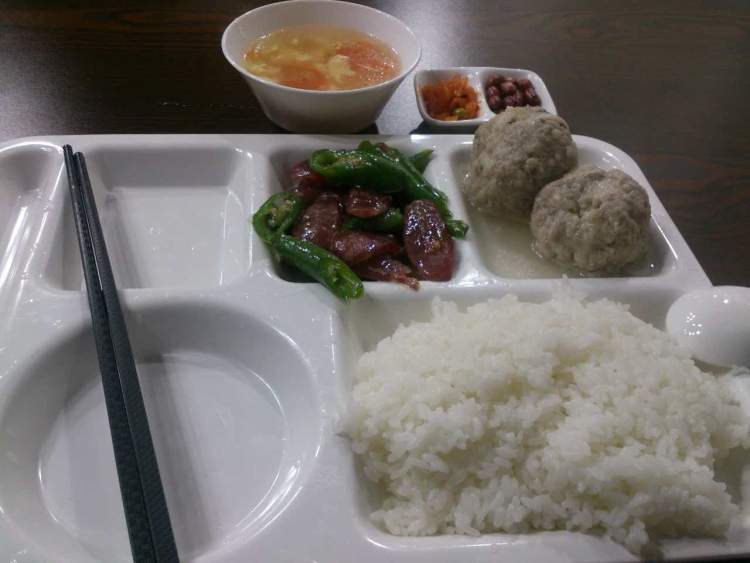 18元的套餐有一大荤,一小荤和一个素菜,米饭可以添加,爷叔重点推荐了新鲜出炉的扬州狮子头,一份有两个,个头确实不小。爷叔说,这是他们的扬州大师傅亲自捶打肉糜制作的。小北拿到餐盘之后,爷叔热情地给我递来筷子和勺子。由于没有看到想吃的蔬菜,最后一道土豆片是一出锅就直接给了我第一勺,一旁还有装着萝卜干以及花生米的小菜碟。戳开扬州狮子头,其中肉质成条形状,可以看出这不是机器做的绞肉,因为用机器绞肉的话,肉质基本已经松散,很难有条状连接的情况。