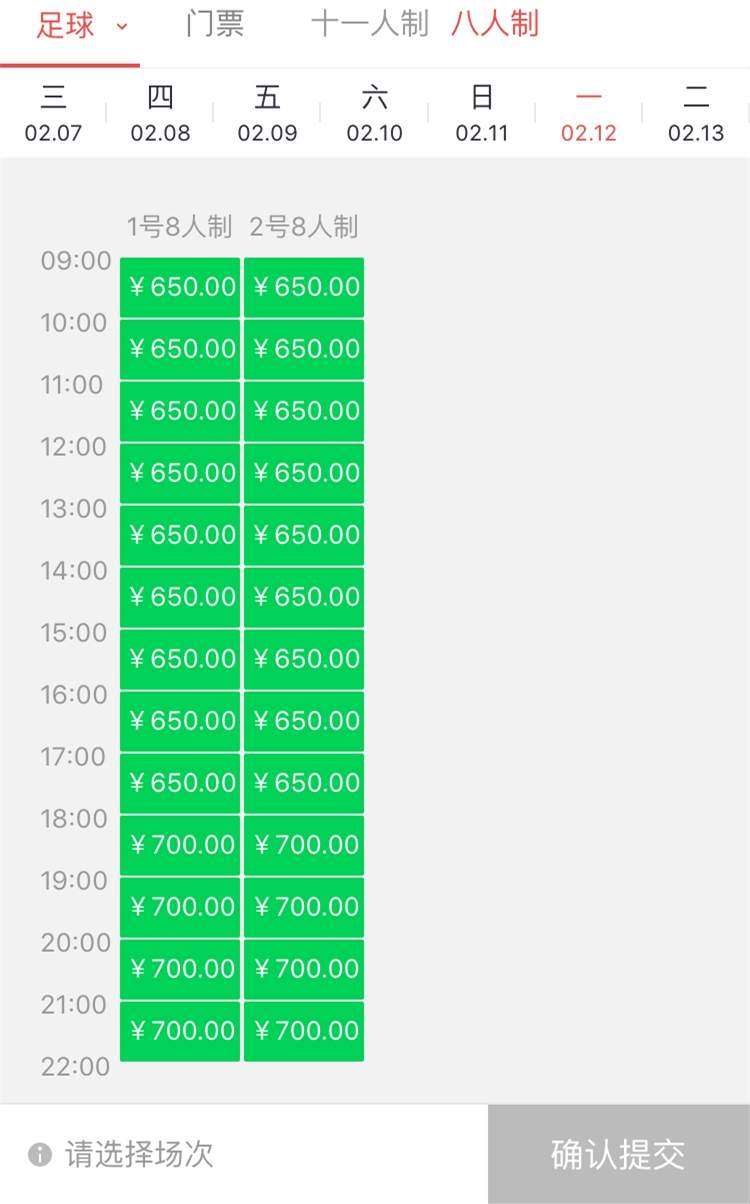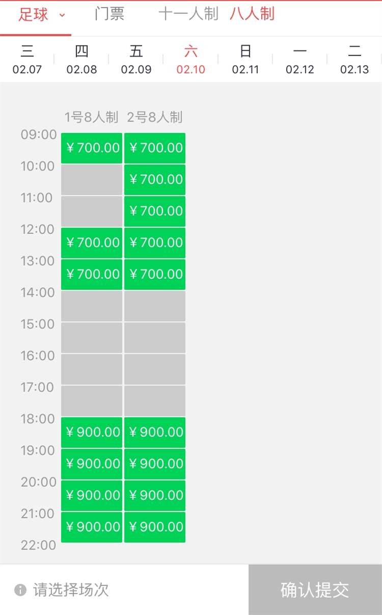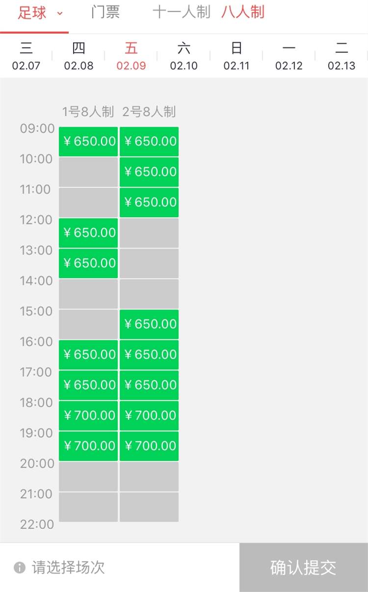 八人制场,价格在每小时650元至900元不等,同时段双休日略微贵些,夜场仍比白天场贵出不少。