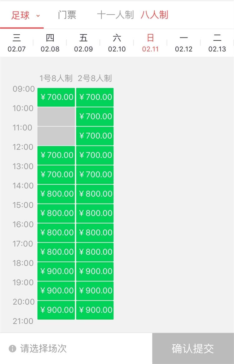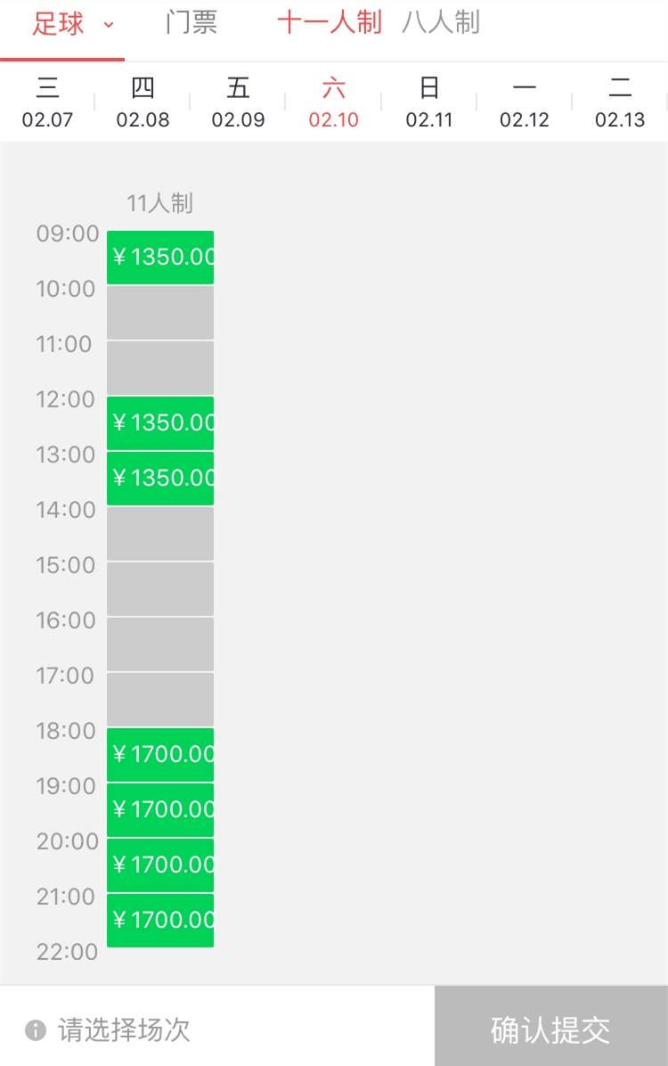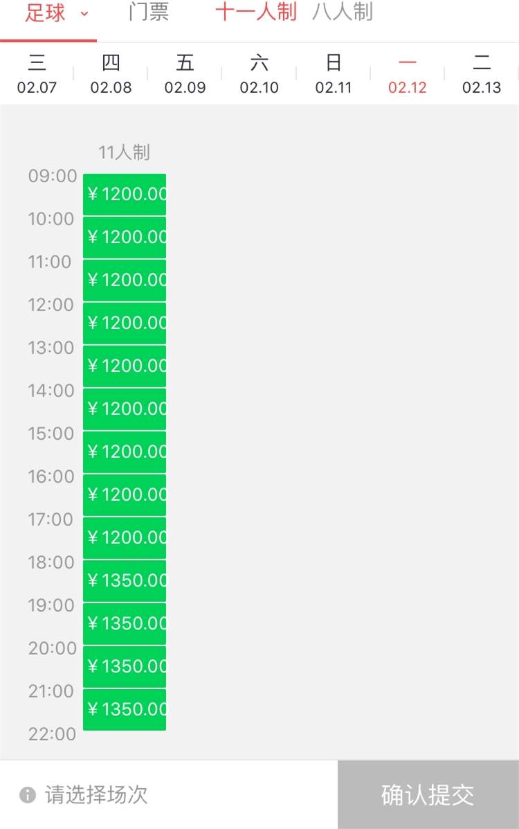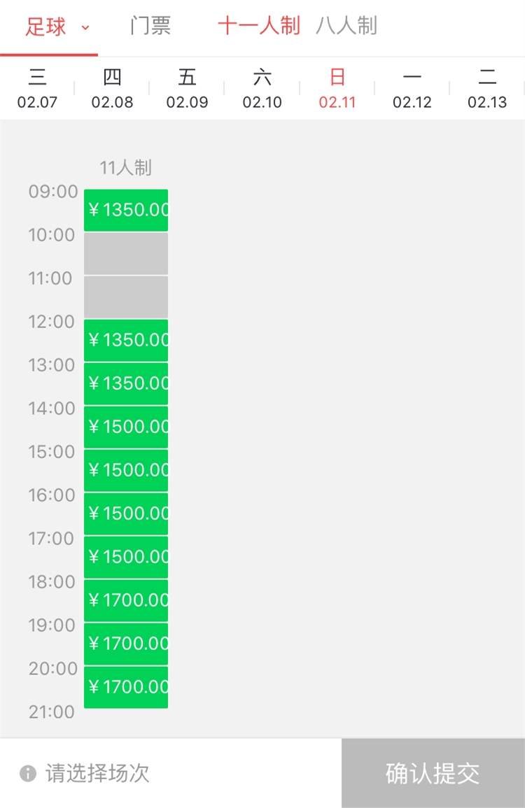 十一人制场,平日场地价格在每小时1200元至1350元,而双休日价格则在每小时1350元至1700元之间,夜场较白天场贵出不少。