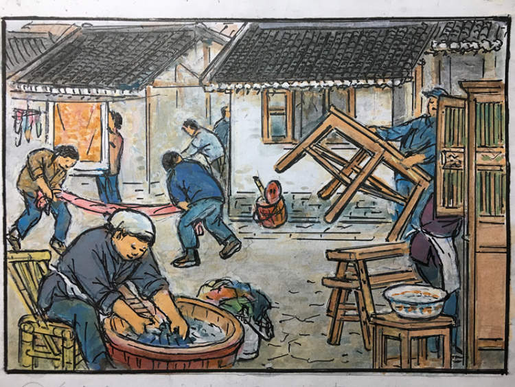 逢年每到过春节,居民传统好风习,碗橱桌椅搬屋外,衣衫被褥都洗晒。