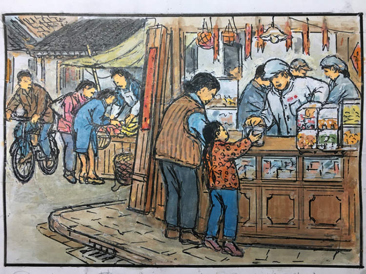 再次,是要购买、备足新年所用的各色食品。过去,物质匮乏菜难买,鸡鱼肉蛋和蔬菜都限购,为了准备年夜饭,主妇们需要早早排队凭票买。每户磨粉磨面,为包汤圆、做年糕,取“团团圆圆”“年年高”之意。