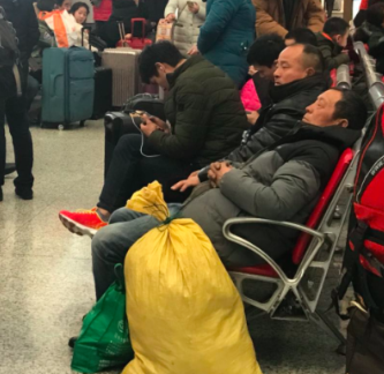 在记者和老薛聊天的几十分钟后,检票口传来了开始检票的声音,原本座无虚席的休息区域多出了几个空位置,老薛起身坐上了位置,记者也结束了和老薛的对话。十多分钟后,记者再次路过老薛一行人等待的区域发现,老薛窝在座位中央,沉沉进入了梦香……