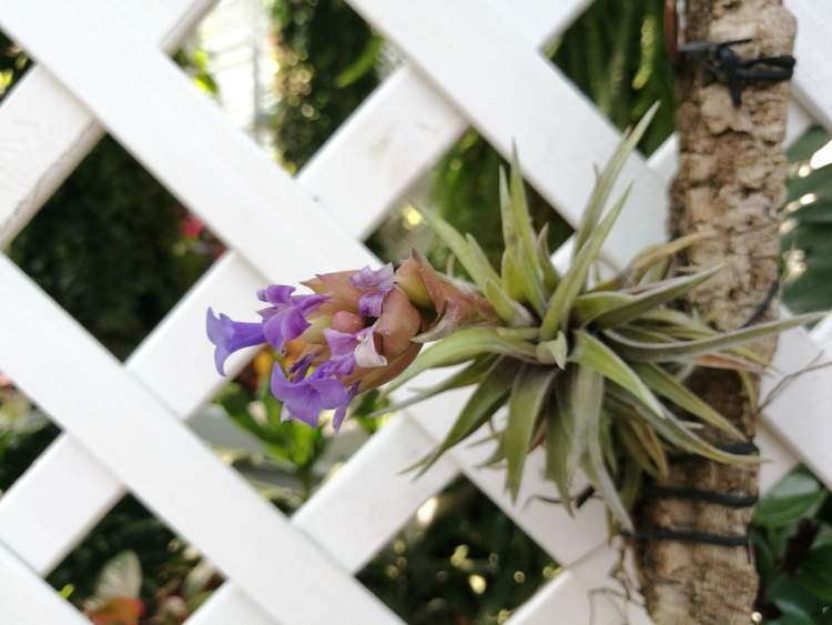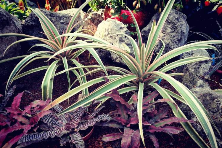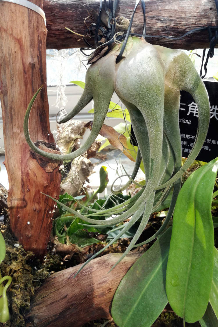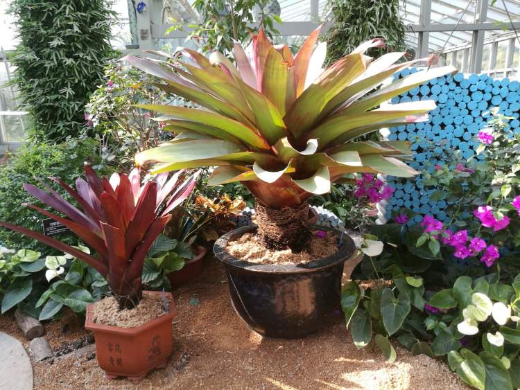 说起凤梨,大家首先想到的可能是热带水果——菠萝,一种生长于土壤中的水果。事实上,凤梨家族极为庞大,全科共有3000余种。凤梨科植物叶色斑驳,花色艳丽且花期持久,观赏价值极高,主要分布于中、南美洲的热带、亚热带雨林、海滨、沙漠之中。本次花展所展示的凤梨科植物涵盖铁兰属、丽穗凤梨属、彩叶凤梨属、雀舌兰属、光萼荷属、刺齿凤梨属、星花凤梨属、姬凤梨属、凤梨属、刺垫凤梨属、水塔花属等共计10余个属、180余个种(含品种),展示株数达到1000余株,其中不乏许多特色品种。