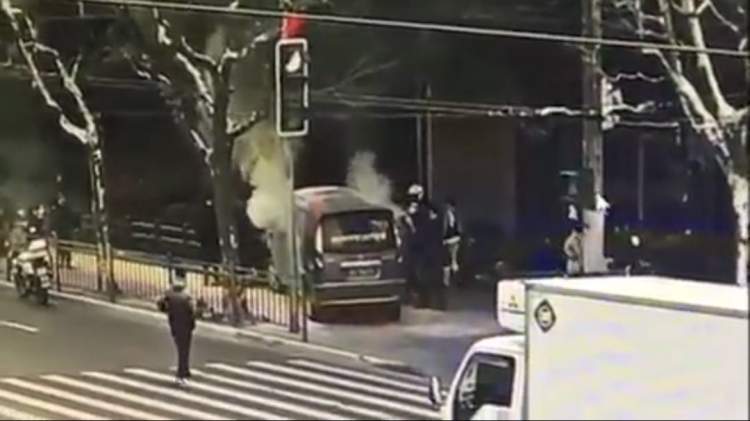 “车子着火了,哪里有灭火器?”他走到人民公园门口,看见有一群人调头往回走,像是前方出事了。穿过人群,吴斌看到了那辆撞在人行道上的面包车,当时,车窗里的烟往外冒,火星四起。三、四个人被卡在面包车和树之间,面部带血,难以动弹。