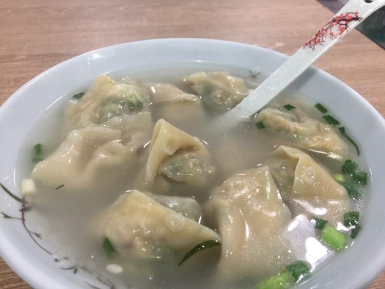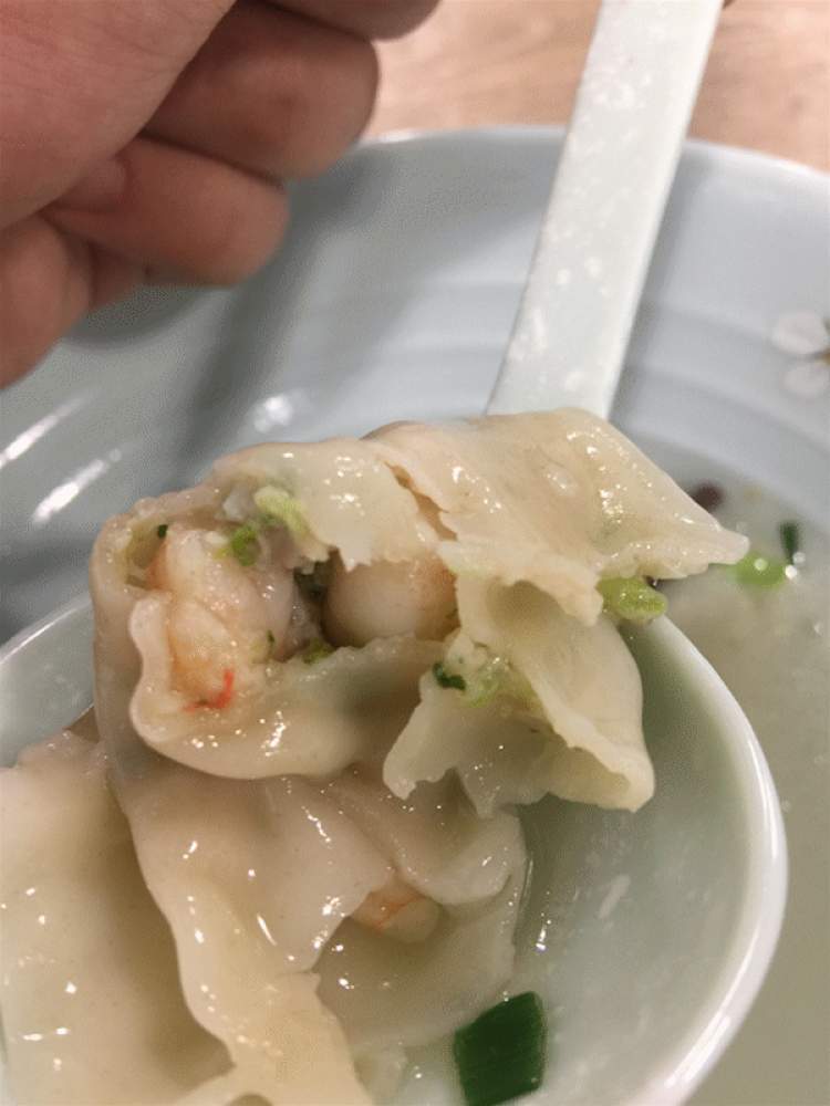 莘莘点的是全家福馄饨,18元的价格比起市面上的某连锁馄饨品牌略微有点贵。馄饨的味道比较清淡,汤底里加了少许猪油,咬开一个菜肉馄饨,里面的肉都是瘦肉。吃完也没有口干,证明馄饨里没有放味精,就像家里妈妈包的那样。