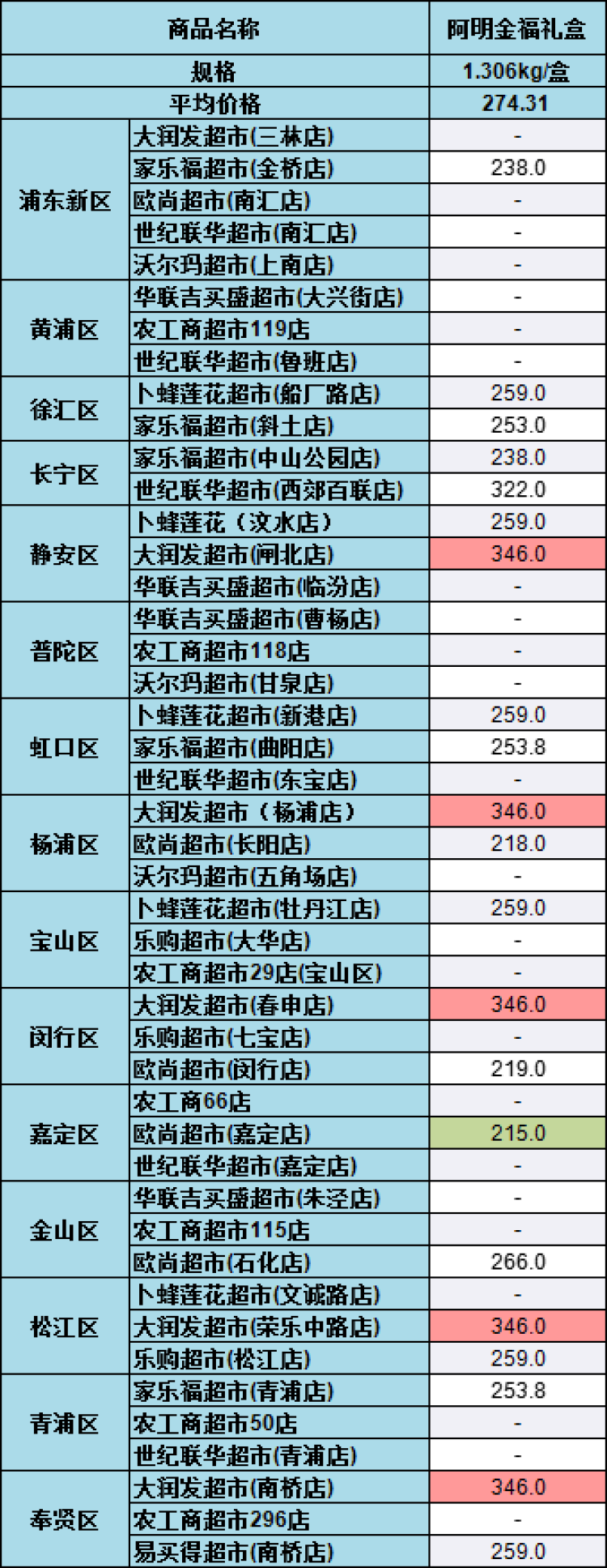 在坚果类中,品名为阿明金福礼盒(1.306kg/盒)的价差最高,为131.00元。其中,大润发超市闸北店、杨浦店、春申店、荣乐中路店、南桥店最高,为346.00元;而欧尚超市嘉定店价格最低,为215.00元。