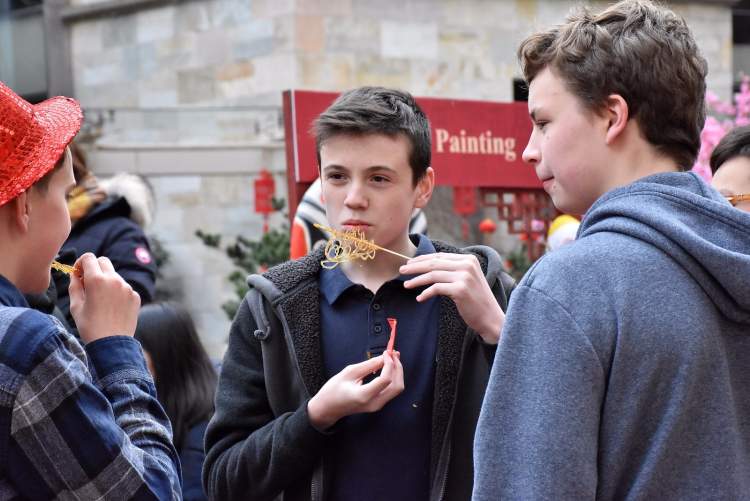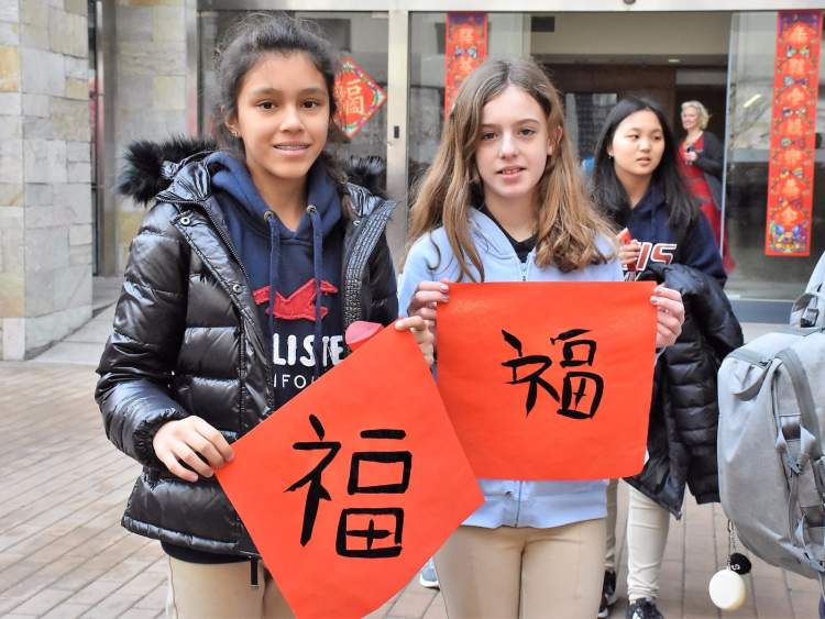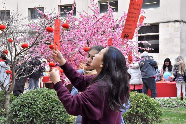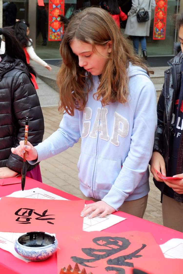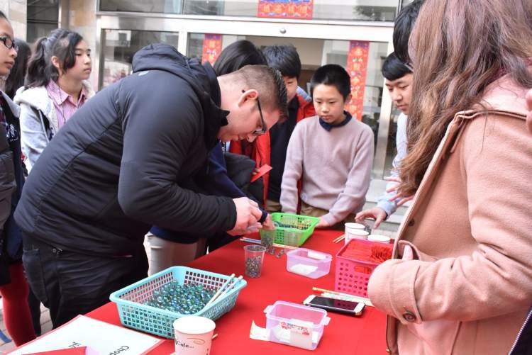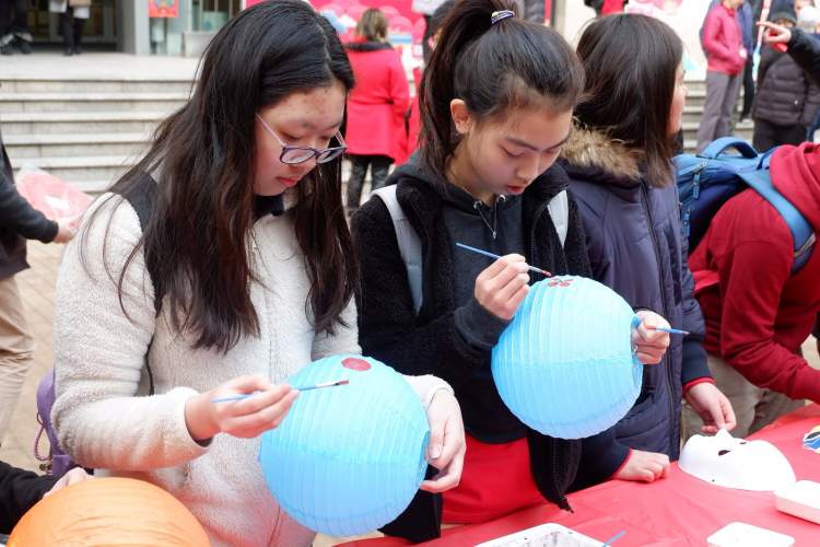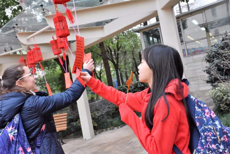 长宁国际学校校园内大红灯笼高挂,一批中华优秀传统文化项目被送进了国际学校。猜灯谜、做糖画、写福字、编手绳、画脸谱、打年糕,现场人声鼎沸,浓浓的过节氛围。