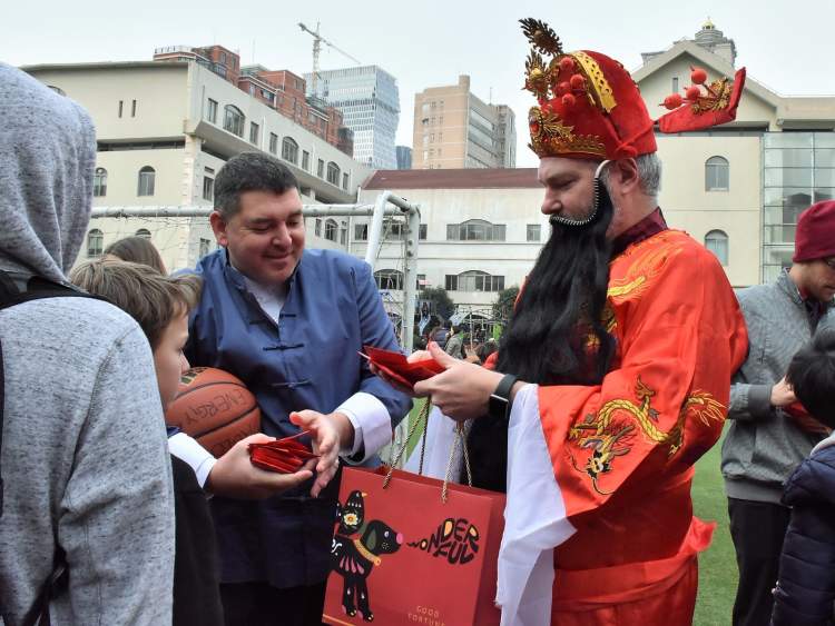 外国教师扮起了财神爷,给学生们发红包。