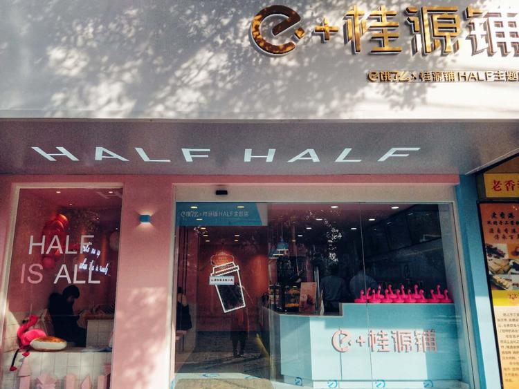 这家店颜值真心是高,招牌是高大上的白色配金色。主题是“半”(half),一半是粉红,一半是粉蓝,看起来素雅而清新。