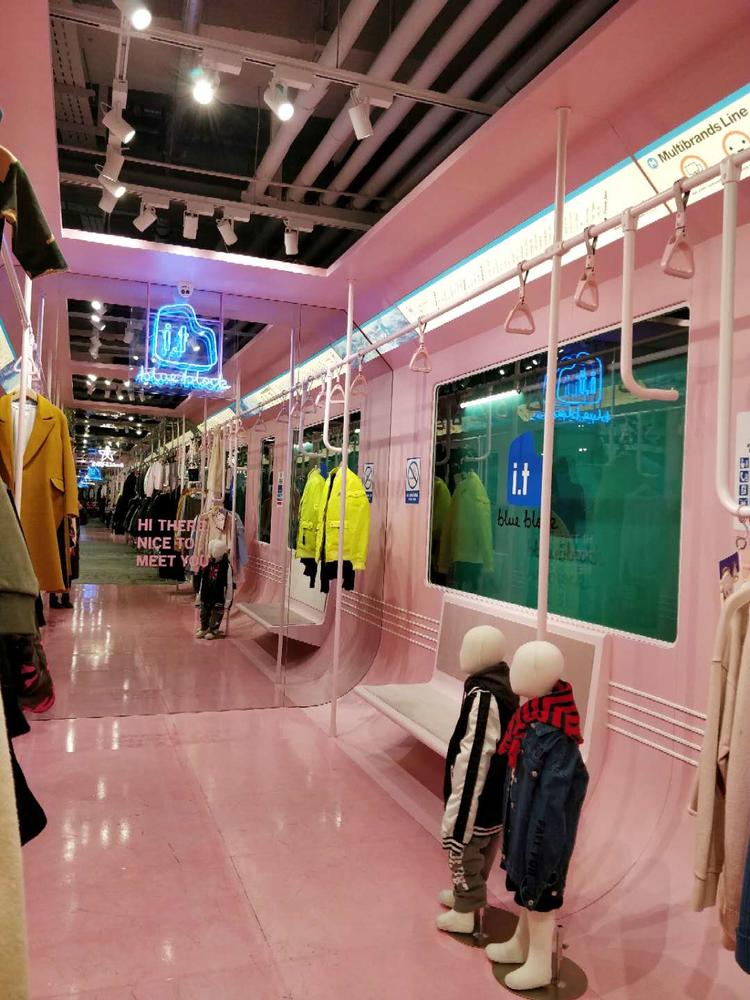 最好玩的是地铁车厢。座位、扶手、拉手、线路图、火警提醒在两节车厢内一应俱全,衣服自然而然地挂在杆子上,整面镜子映衬得空间开阔,非常适合自拍。