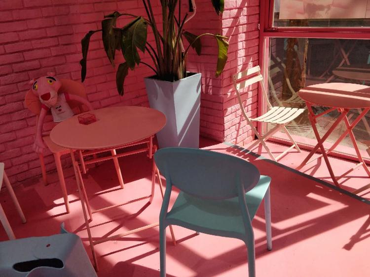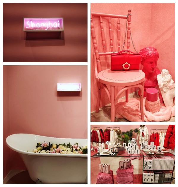 而在店内其他角落,布置着各种各样的粉色小道具——盛满花的浴缸,写着Shanghai的粉色灯箱,粉色的椅子……倒也不全是粉嫩嫩的,茫茫一片粉墙中,白色、黑色、大红交织着出现,避免饱和度太高。