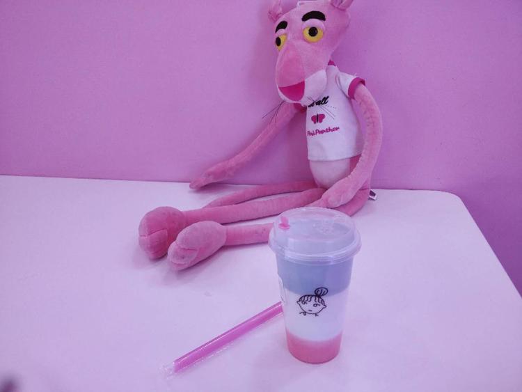 饮品也贯彻了把粉红进行到底的宗旨。独角兽以火龙果与蓝甘菊为原料,做成了一杯粉白色的旋风;芝士奶盖三色杯共有三层,从下至上分别是草莓果冻、牛奶和香芋;粉红粉红的一天、独角兽冰沙、焦糖奶茶、浪漫樱花也都是粉红色的。