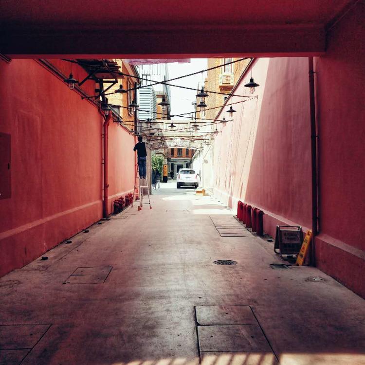这堵墙位于静安区一条安静的小路上,本身只是上海千万条小弄堂中的一条。在被联合办公空间WeWork租用后,他们将这条通向办公空间的弄堂整体刷成了粉红色,空中则使用菱形交叉的绳索,悬挂着颇有设计感的灯。中式牌楼构成了画面的背景,形成很有上海特色的中西合璧之景。