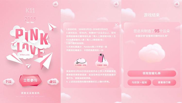 强烈推荐“甜蜜云朵制造机”活动,一个经典爱意棉花糖58元,一个PINK甜蜜棉花糖38元。通过扫码关注微信公众号“K11”,可以参加制造云朵大作战,每成功制造超过88个云朵,送一个经典爱意棉花糖,最多送10个。