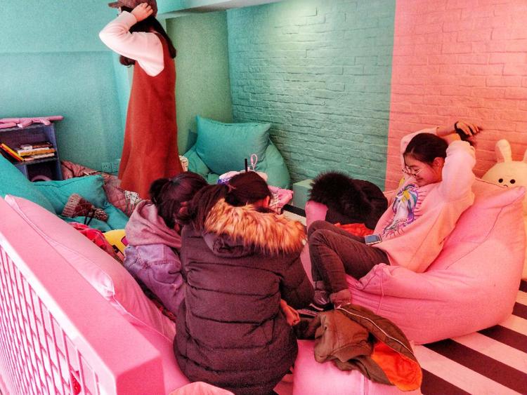 店里位置不多,一楼有一个小桌子,走上楼梯有四个懒人沙发,设计成薄荷绿和少女粉的撞色效果。
