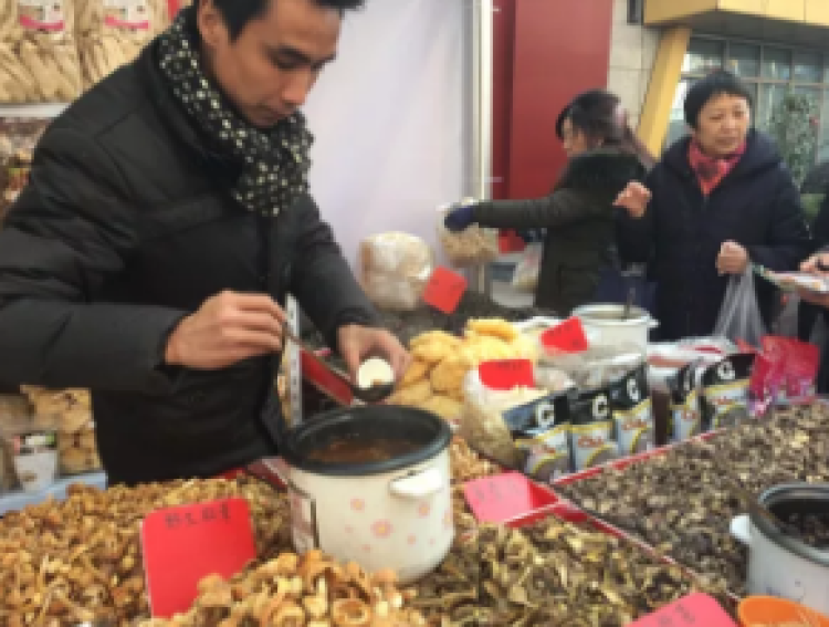 一群阿姨正在品尝来自云南的松茸、黄金菇和牛肝菌熬成的养生汤,纷纷赞其货真价实。
