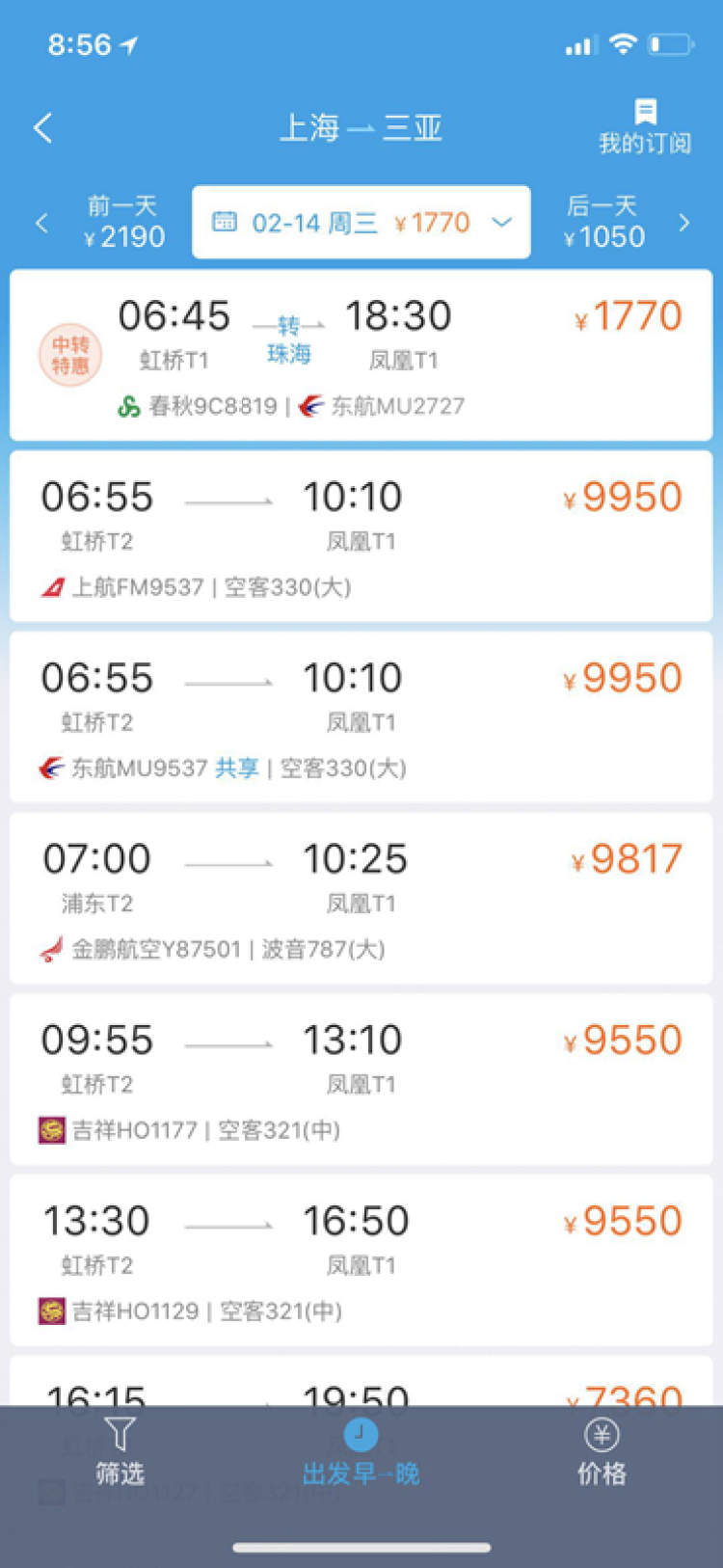 “春节前三天,从上海飞到三亚最便宜的全价经济舱票价为1850元,算上机建燃油就是2850元,远远高于往日。”9日,准备帮朋友订去三亚度假的市民刘先生看着手机订票网站上仅剩的机票和相应价格,显得十分无奈,“前天看到一班刚加的新架次,没两天就显示余票紧张了,而且我买的还是中转机票,要坐10个多小时,但2580都是最便宜的了!”