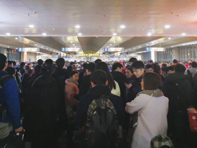 相比2月1日春运开始的第一天稀松平常和慢悠悠的人群,今天,旅客取票得排队,进站得排队,候车室更是挤满了人!