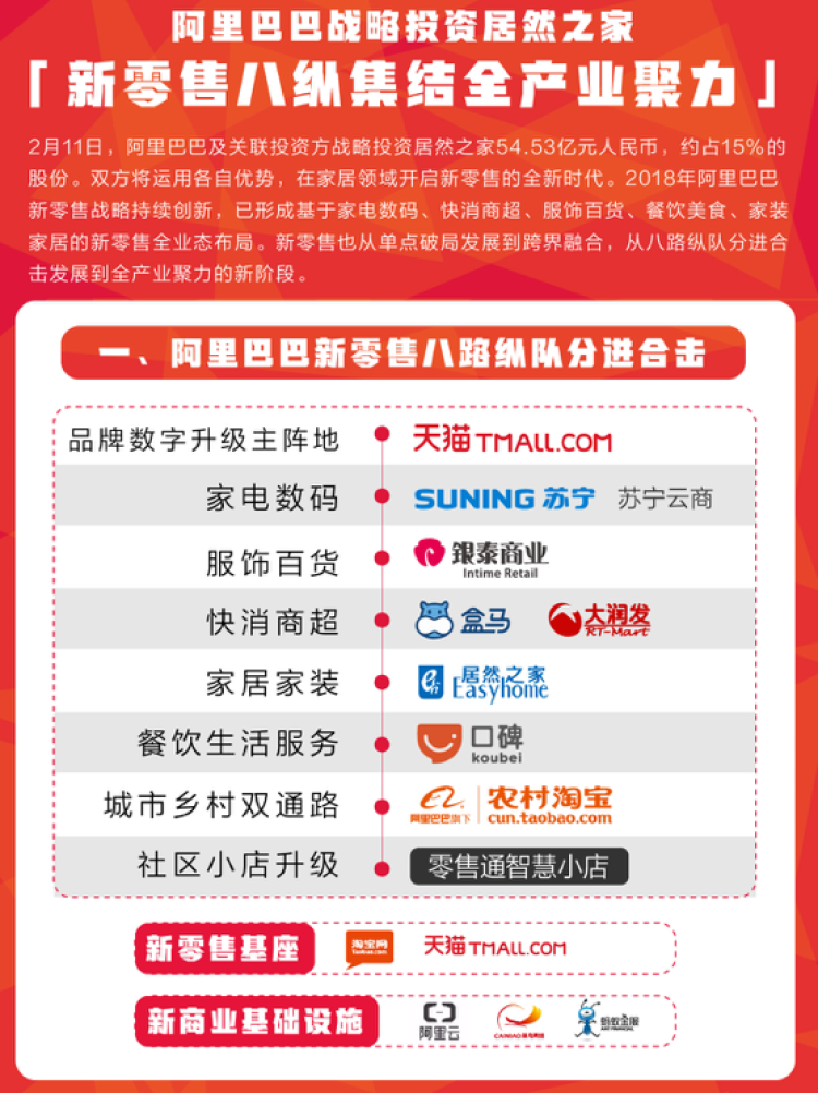 2月11日,北京居然之家投资控股集团有限公司(以下简称“居然之家”)与阿里巴巴集团共同宣布达成新零售战略合作:阿里巴巴以及关联投资方向居然之家投资54.53亿元人民币,持有其15%的股份。双方将运用各自优势,在家居领域开启新零售的全新时代。