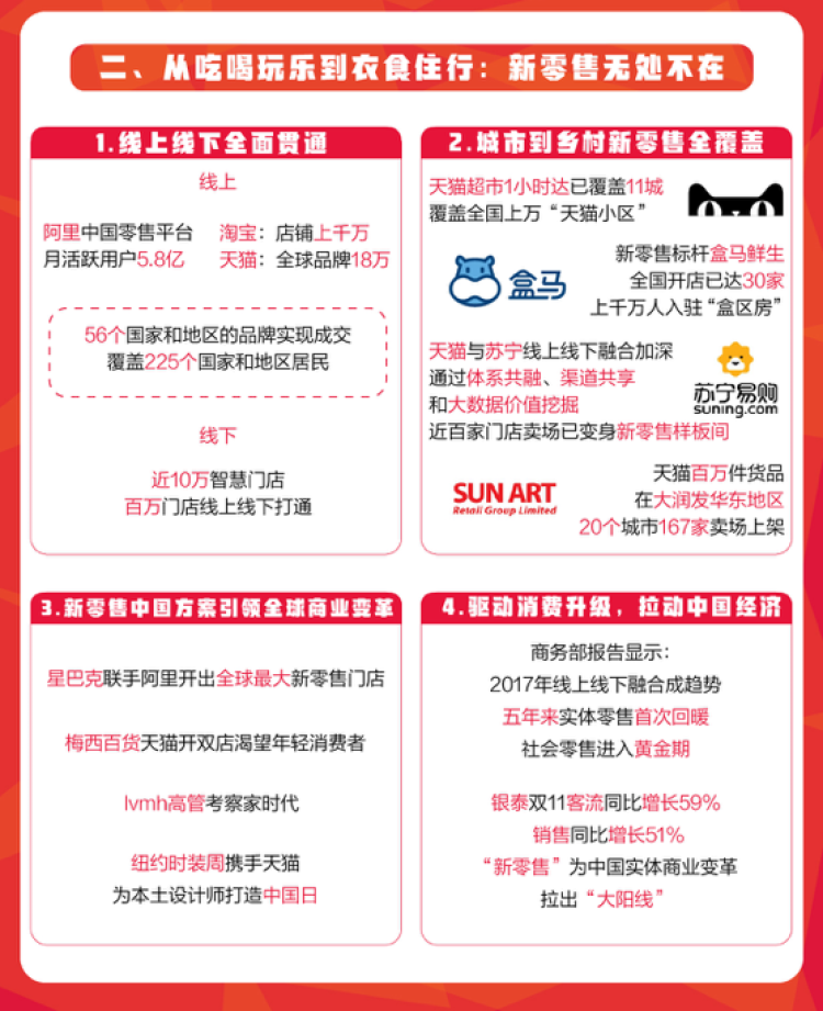 代表线上商业力量的阿里巴巴和传统线下零售业态的战略合作与业务融合,一环延展一环,一路融合一路,使得万物互联时代背景下的新零售版图日益完整。在新零售力量的推动下,传统实体零售企业在2017年焕发活力。