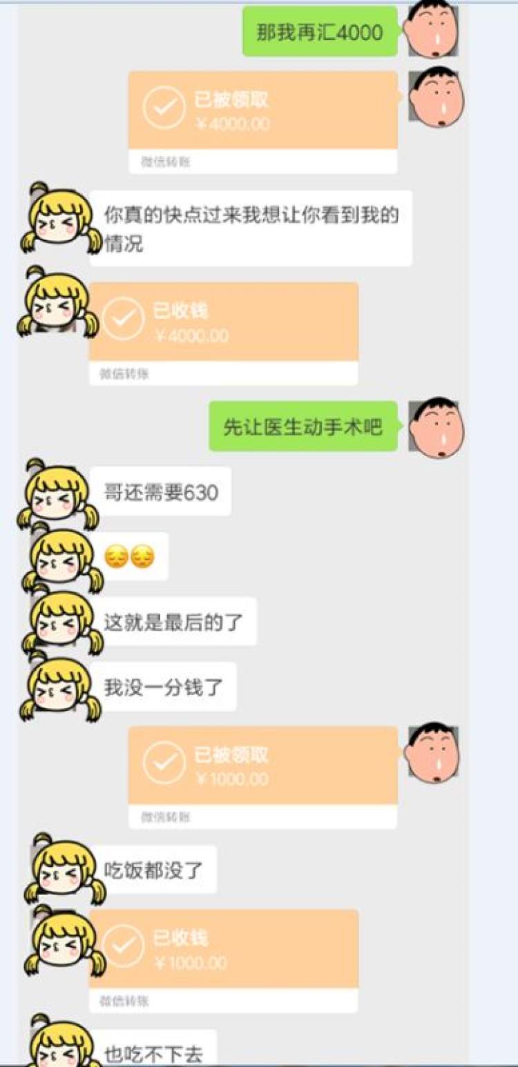 去年11月,“琪琪”告诉陈先生,说她的表妹意外怀孕需要堕胎,可为了瞒着家里人,不方便问家里要钱。陈先生二话没说就给“琪琪”打了1000块钱过去,自以为这样慷慨的行为可以博得对方的欢心。然而,“琪琪”又表示表妹进了医院后发生各种突发状况,急需一大笔医疗费,陈先生觉得帮人帮到底,但手头又没有那么多钱,只能通过网络和民间借贷,陆续给对方转账了20余次,累计8万余元。
