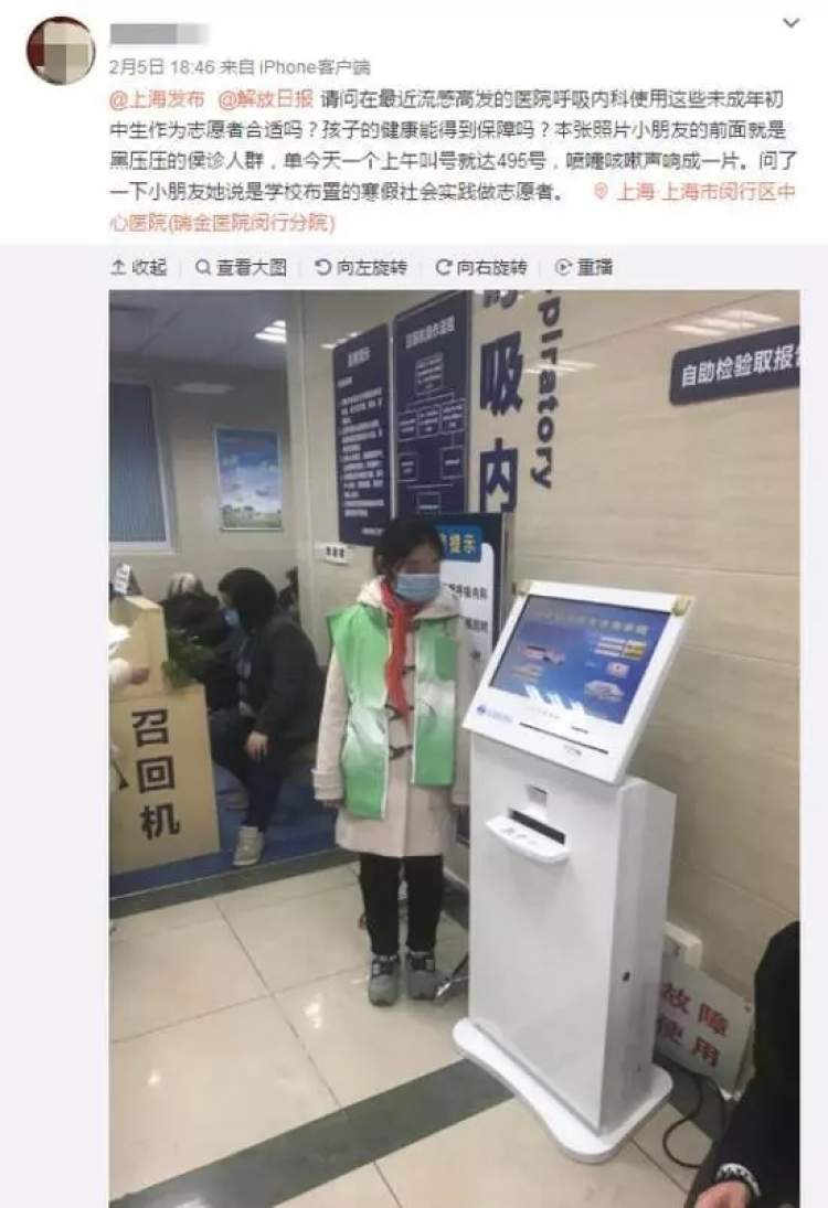 早些时候,有微博网友发布一张“初中生在医院呼吸内科的自助机旁担任志愿者”的照片,引发热议