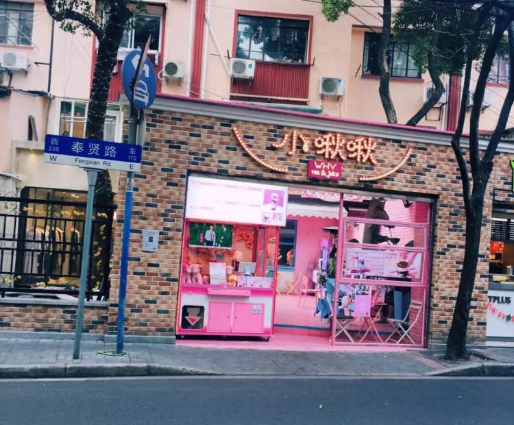 还没有进店,远远地就在一片老公房之间看到了小啾啾炒鸡粉嫩的装修风格。粉红色的格调和几个超大的洋娃娃,使店面在沿街商铺中显得俏皮可爱。