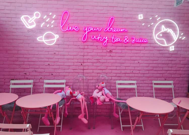 走进店内,像是走进了一片梦幻的粉色世界。桌子、椅子和各种小摆饰,都是粉色系列的,简单又可爱,少女心爆棚了有木有啊〜用餐处在点单处和取饮品处之间,是一个复合式的小院子,桌椅上摆了不少顽皮粉红豹,连小角落内还有娃娃机。布置这样的一片小天地,老板大约也是一个细致又有趣的人。