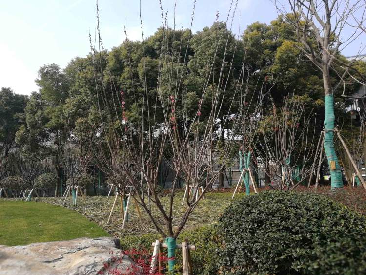 西南角的东景园靠近静安新业坊动漫创意产业园。由于正值冬春交替,周到君看到,绿地中还有梅花点点。