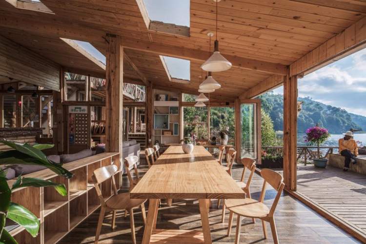 “等风半山”在装修风格上秉承“天地人和”的理念,取背山面水之势,力求与本地风土人情相融合。建筑外观以青石为原料,简约大方,再配合以摩梭人木楞房特有的泥木结构,将传统与现代、稳健与灵动、实用与审美相结合,给人以独特的居住体验。酒店房间数量只有18间,为客人留出了足够的公共空间以为观景之用,在观景露台遥望格姆女神山,目光扫过波光粼粼的湖面,亦可将里务比岛收于眼底,傍晚时闲坐小院,观览落日红霞,更是别有风味。