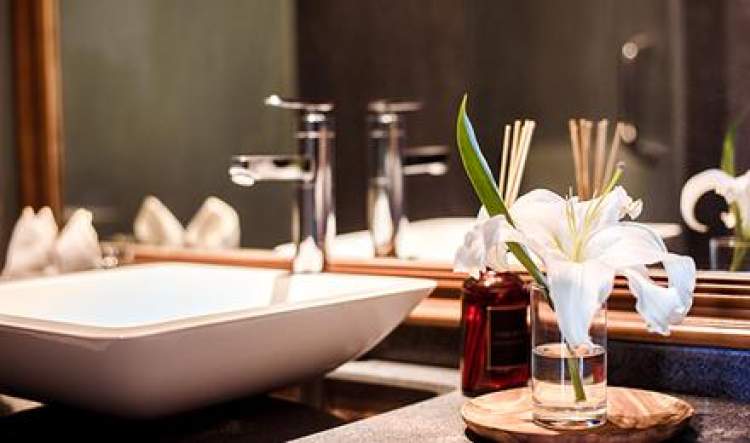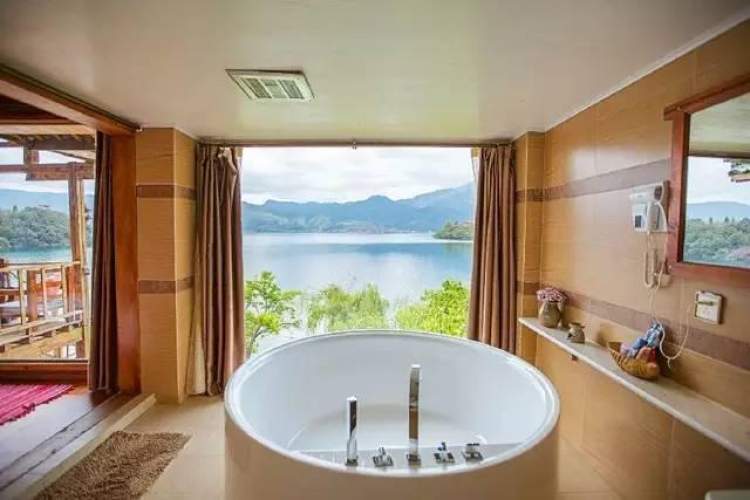 为了开阔视野,主人把每个房间都去掉了临湖的墙壁,布置出临湖的独立阳台。从透明落地窗向外能看到由浅及深的湖光山色。洁白的圆形浴缸里,撒上几片玫瑰花瓣,放水进去泡一泡,一天的疲惫都随之消散。