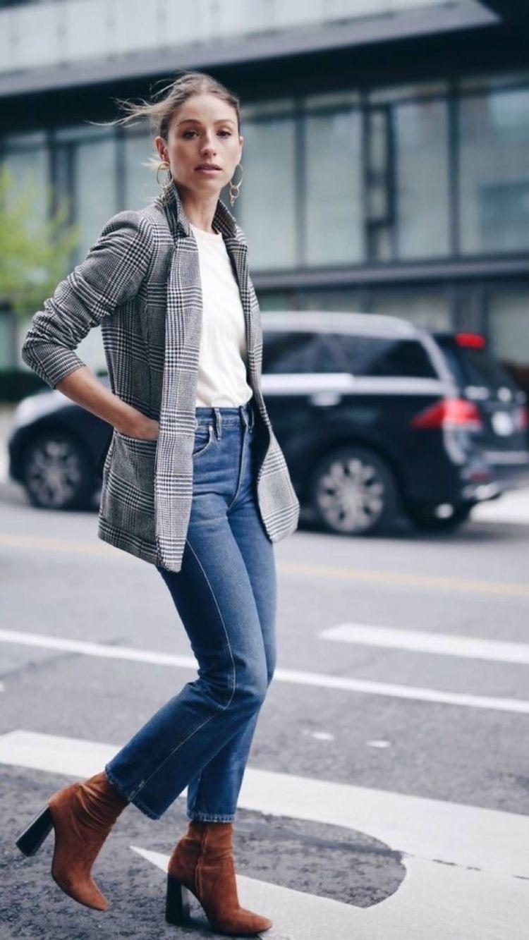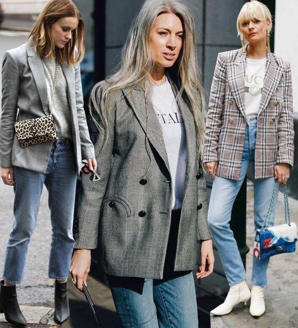 有型又正式的格子西装外套,休闲街头的牛仔裤,两个不同风格的单品混搭在一起却能产生时髦的化学反应!